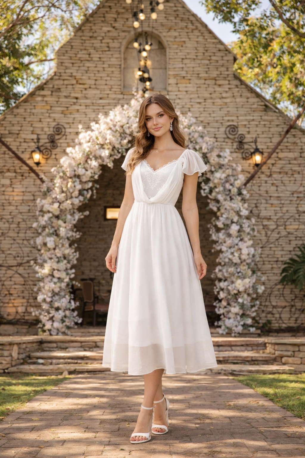 Vestido mídi para casamento civil no tecido Musseline e detalhes em renda. Possui manga.